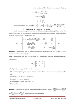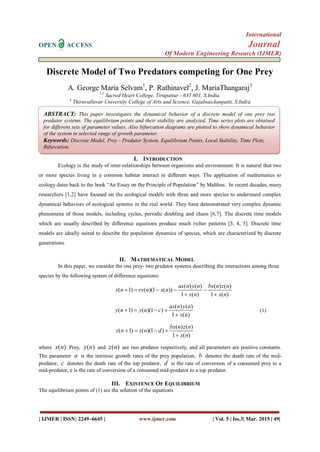 This paper presents a discrete model examining the dynamics of a two-predator, one-prey system using difference equations to analyze their interactions. The study investigates equilibrium points, stability, and bifurcation behaviors of the system through numerical simulations and time series plots. Key findings include conditions for the stability of equilibrium points and the potential for chaotic behavior in the prey population as parameters vary.