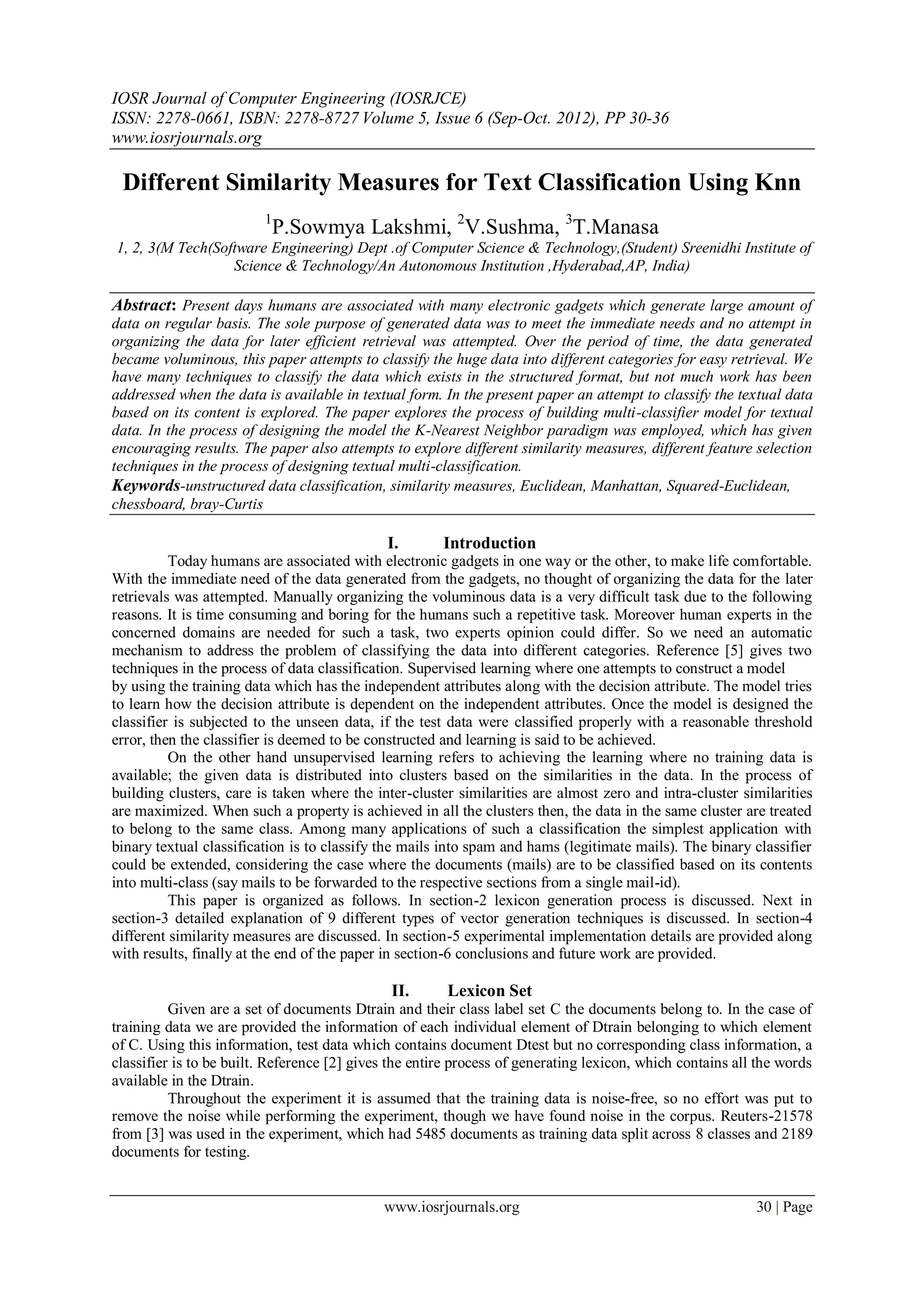 This document summarizes research on classifying textual data using the k-nearest neighbors (KNN) algorithm and different similarity measures. It explores generating 9 different vector representations of text documents and using KNN with similarity measures like Euclidean, Manhattan, squared Euclidean, etc. to classify documents. The researchers tested KNN on a Reuters news corpus with 5,485 training documents across 8 classes and found that normalization and k=4 produced the best accuracy of 94.47%. They conclude KNN with different similarity measures and vector representations is effective for multi-class text classification.