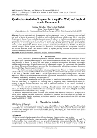 The study investigates the qualitative analysis of ethanolic extracts of the legume pericarp and seeds of Acacia farnesiana, highlighting the presence of 22 phytochemicals beneficial for human health. It concludes that the legume pericarp contains a greater quantity of bioactive compounds compared to the seeds, which express medicinal properties. The research aims to validate the traditional uses of this plant, particularly its potential anti-diabetic effects.
