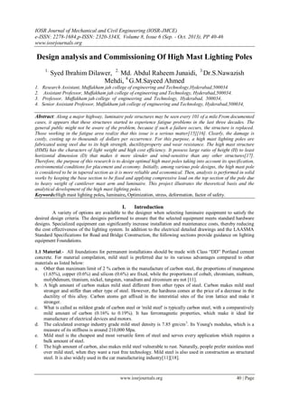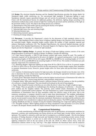 The document presents a design analysis and commissioning of high mast lighting poles, focusing on their structural integrity due to fatigue problems seen over the past three decades. It details the selection of materials, such as mild steel, and the design process for optimizing pole specifications based on environmental conditions and economic factors. Additionally, it outlines methodologies for ensuring proper lighting design, placement, and the importance of intelligent lighting systems to improve energy efficiency and reduce greenhouse gas emissions.
