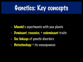 This document covers key concepts in genetics and inheritance patterns, including Mendel's experiments with pea plants, dominant and recessive traits, sex linkage of genetic disorders, and applications of biotechnology. It discusses Mendel's work breeding pea plants and identifying inheritance patterns. It defines concepts like genotype and phenotype and explains monohybrid crosses. It also covers codominance and blood types, sex linkage of traits, genetic disorders, and modern applications of genetics like genetic screening, DNA profiling, genetically modified organisms, and stem cell research.