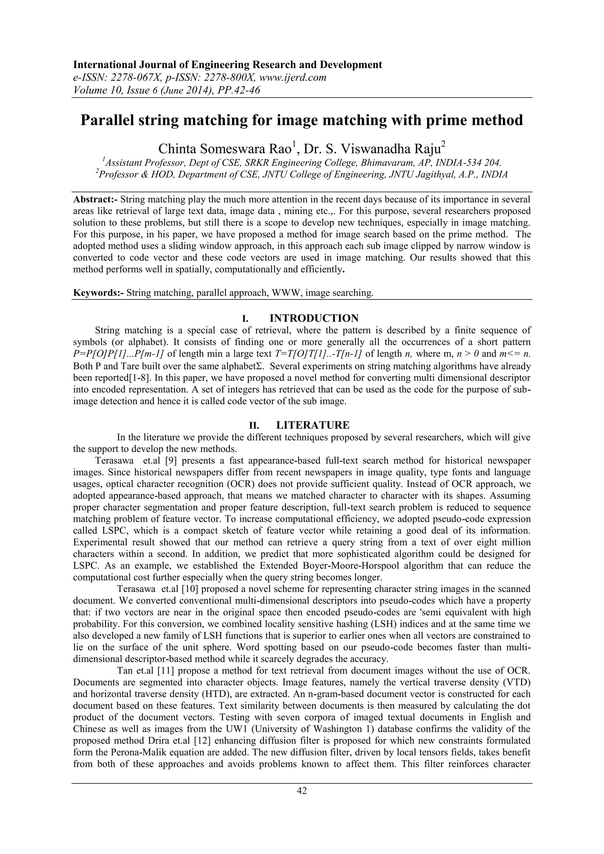 The document discusses a novel method for image matching using a prime method and parallel string matching techniques. It outlines an approach involving image segmentation, vector extraction, code generation, and matching phases to enhance search speed and accuracy in image retrieval. The proposed algorithm shows promising results in computational efficiency and effectiveness in locating sub-images.