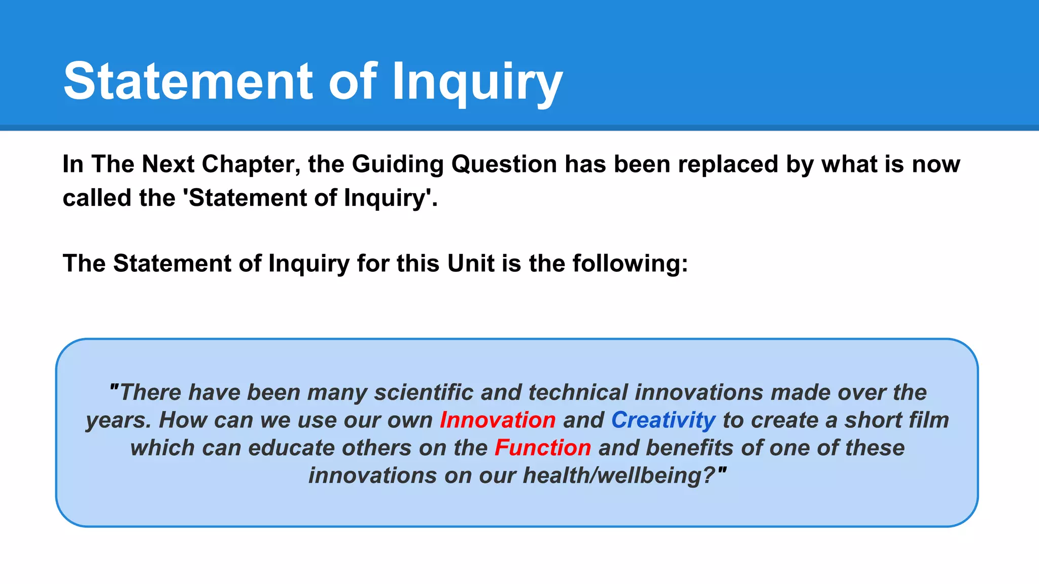 This document introduces a unit that asks students to research a technological innovation for health or well-being and create an informative short film about it. The key concept is creativity, and related concepts are function and innovation. Students will choose a technology to research, investigate its health benefits and functions, and creatively produce a video to educate their target audience on the technology. They can select the target audience and end user, such as students in a particular class, to ensure the video meets their needs.