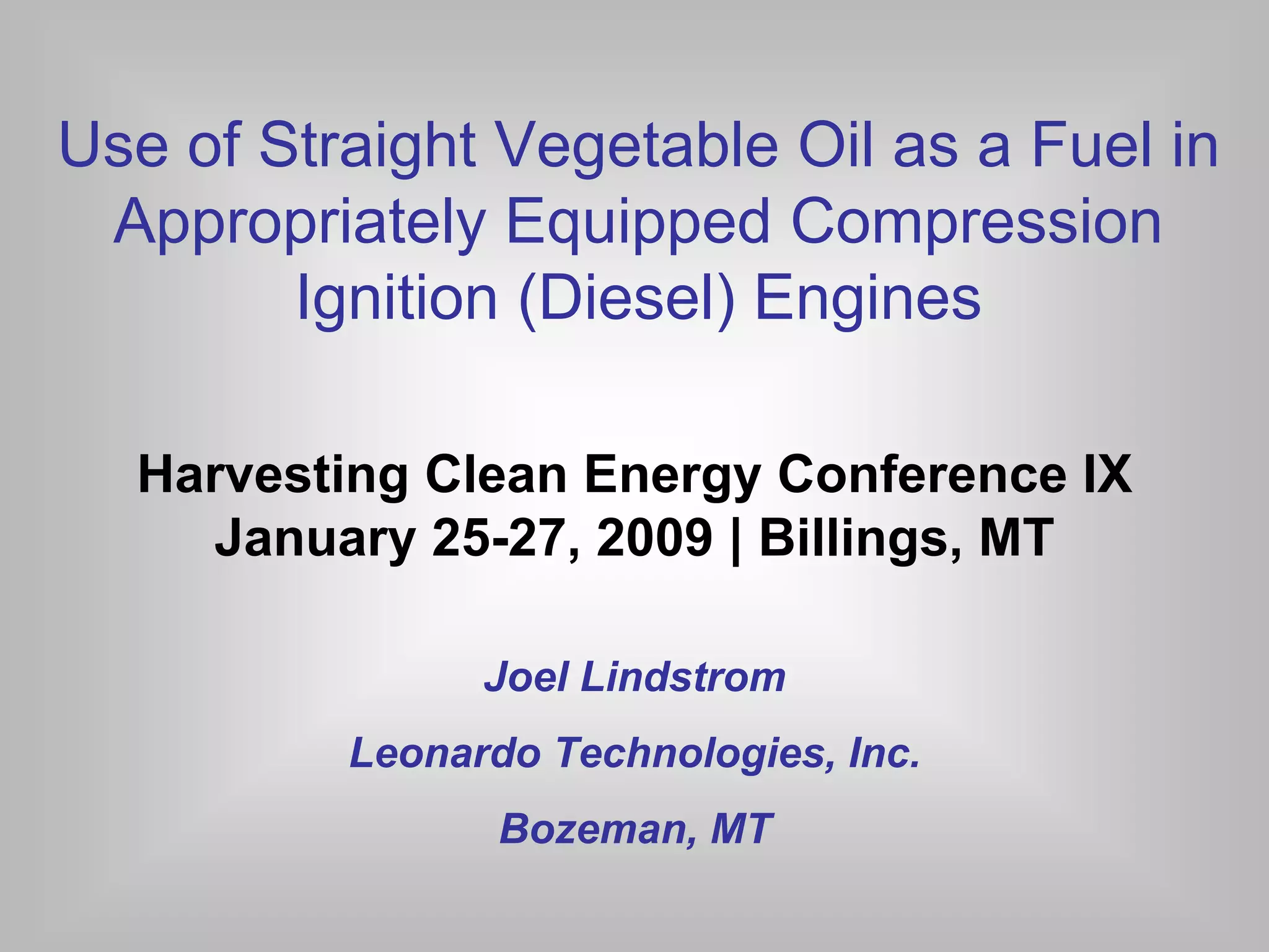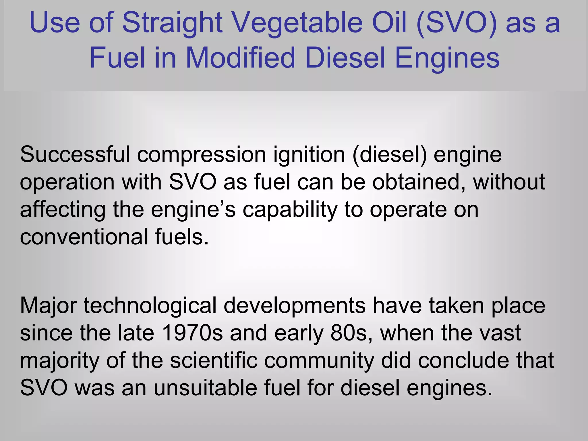 The document discusses the use of straight vegetable oil (SVO) as a fuel in modified diesel engines, highlighting technological advancements that have made it a viable option despite previous concerns. It details the modifications necessary for successful engine operation with SVO, including filtration processes, and shares demonstrative applications in various venues. Emissions tests indicate that fuel quality, through effective filtration, is crucial for long-term engine performance, with oil from camelina seeds successfully powering engines for extended periods.