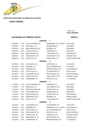 This document contains the schedule for the 2014-2015 season of the Primera Cadete Grupo 2 youth soccer league organized by the Federación Interinsular de Fútbol de Las Palmas in Gran Canaria, Spain. It lists the dates, times, locations and participating teams for 16 rounds of matches between September 2014 and January 2015. The league involves teams from different towns and cities across Gran Canaria.