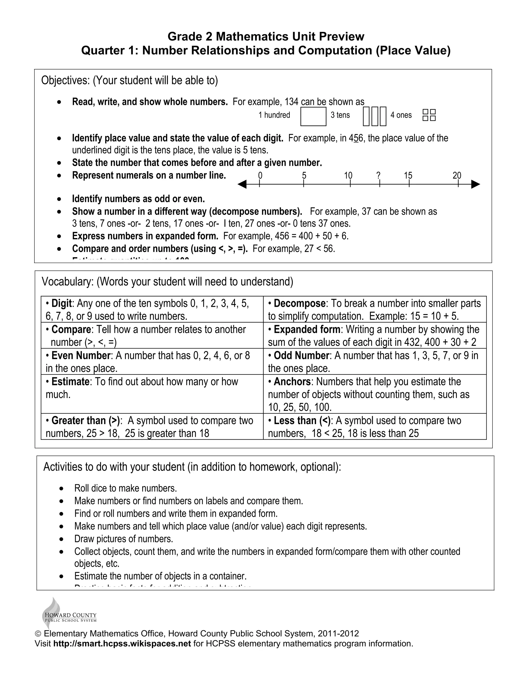 This document provides an overview of the Grade 2 mathematics unit on number relationships and place value. The unit objectives are for students to read, write, show, identify place values, compare, decompose, and order whole numbers up to 100. Key vocabulary includes digit, compare, even/odd numbers, estimate, greater/less than, and expanded form. Suggested activities to reinforce the concepts include using dice, counting objects, estimating quantities, and practicing basic addition and subtraction facts.