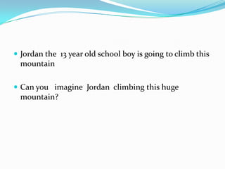 This document is a quiz about Mount Everest presented by a second grade student. It contains questions about the location and height of Mount Everest as well as whether it has snow. It also includes a question about the tallest mountain in Africa, which is Mount Kilimanjaro. The document contains images of Mount Everest from different angles and sides as well as pictures of Mount Kilimanjaro at sunset and its melting snow.