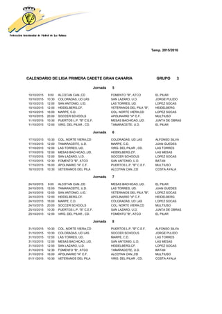 This document contains the schedule for the 2015/2016 season of the Primera Cadete Gran Canaria league group 3. It lists the dates, times, and participating teams for 14 rounds of matches. Important notes are included that matches can only be changed for reasons of force majeure and any errors in the schedule must be reported within 5 days.