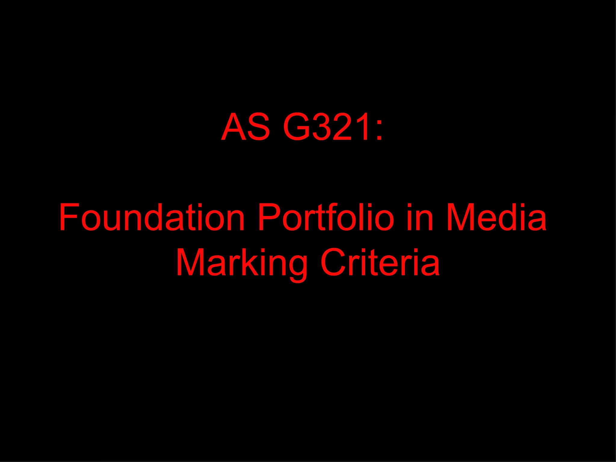 This document outlines the marking criteria for a media foundation portfolio assignment. It is divided into 3 sections: 1) Research and Planning, 2) Construction, and 3) Evaluation. For each section, it describes the levels of achievement from Minimal to Excellent and the criteria for each level. The criteria address aspects of the assignment like quality of research, organization, technical skills, audience feedback, and ability to discuss lessons learned. Students will be marked on their ability to complete the different stages of production, address key questions in their evaluation, and demonstrate their progression overall.