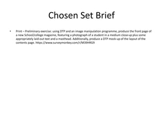Nathan Paul Edser has submitted a foundation portfolio for a media course. The portfolio includes a preliminary exercise to design the front cover and contents page of a new school/college magazine. Nathan analyzed conventions for magazine covers such as including the masthead, central image, and plugs. He also examined conventions for contents pages like subheadings, previews, and contact information. Nathan designed mockups for the front cover of "Sponne Weekly" featuring a photo of Bruno Mars and for the contents page laying out article topics and page numbers. He discussed representations in the central image and choices of fonts, layouts, and color schemes.