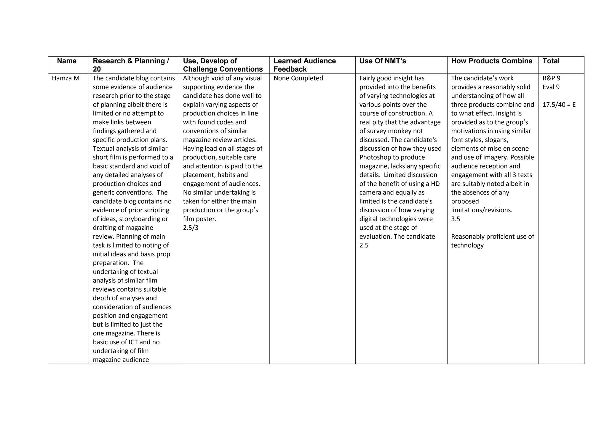 The candidate provides evidence of audience research and planning for a music video production. Comparable media products were analyzed and generic conventions considered to help inform production choices. Feedback was gathered from audiences and used to refine elements of the three related products created - the music video, website, and digipak. The candidate demonstrates knowledge of production technologies and digital skills. Overall planning and use of audience input was thorough, though could have been more detailed in discussing the combined finished products and audience reception.