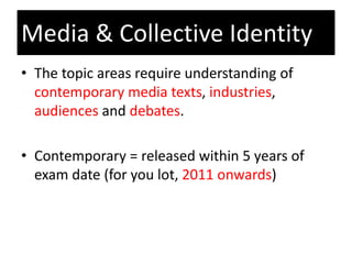 This document provides advice for writing an A2 Sec B response on the topic of media and collective identity. It recommends choosing contemporary case studies from 2011 onwards involving at least two media. Responses should demonstrate understanding of representation, industries, audiences and debates. Answers must address the four prompts and cover the historical, contemporary, and future aspects of the chosen topic area, with an emphasis on the present. Examples should come from a variety of media texts, theories, and debates to show a balanced response.