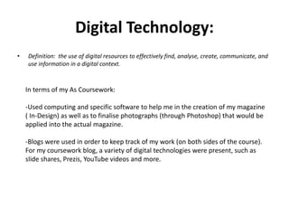 This document discusses the use of digital technology, creativity, research and planning, post-production, and conventions in the creation of a magazine coursework project. Specifically, it mentions:
