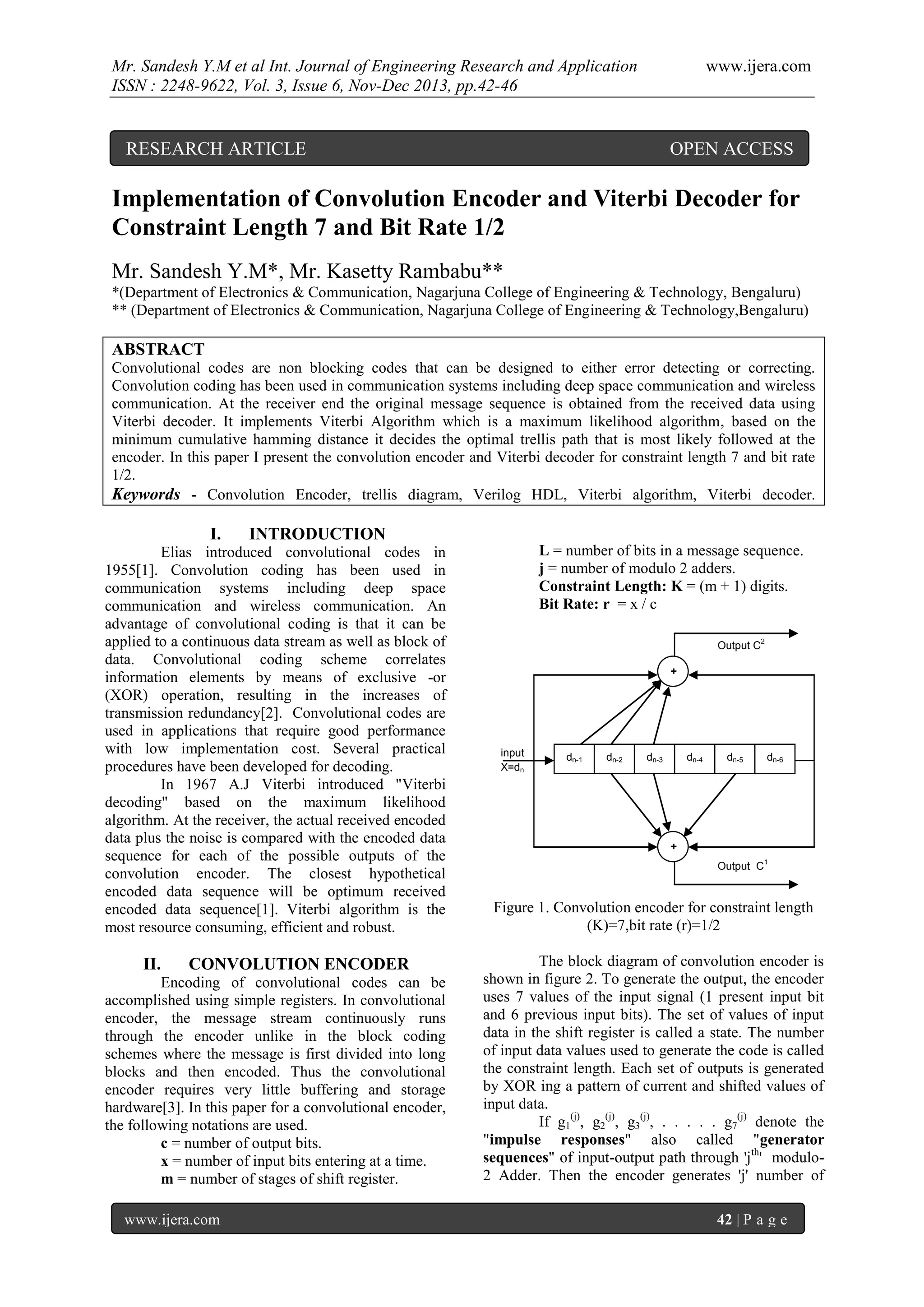 The document discusses the implementation of a convolution encoder and Viterbi decoder with a constraint length of 7 and a bit rate of 1/2, utilizing Verilog HDL. It describes the encoding process, including the state diagram, the code tree, and the functioning of the Viterbi decoder, highlighting the algorithm's efficiency in error correction. The synthesis and simulation results demonstrate the design's effectiveness in handling noise and errors, confirming its capability to retrieve the original message sequence from corrupted data.