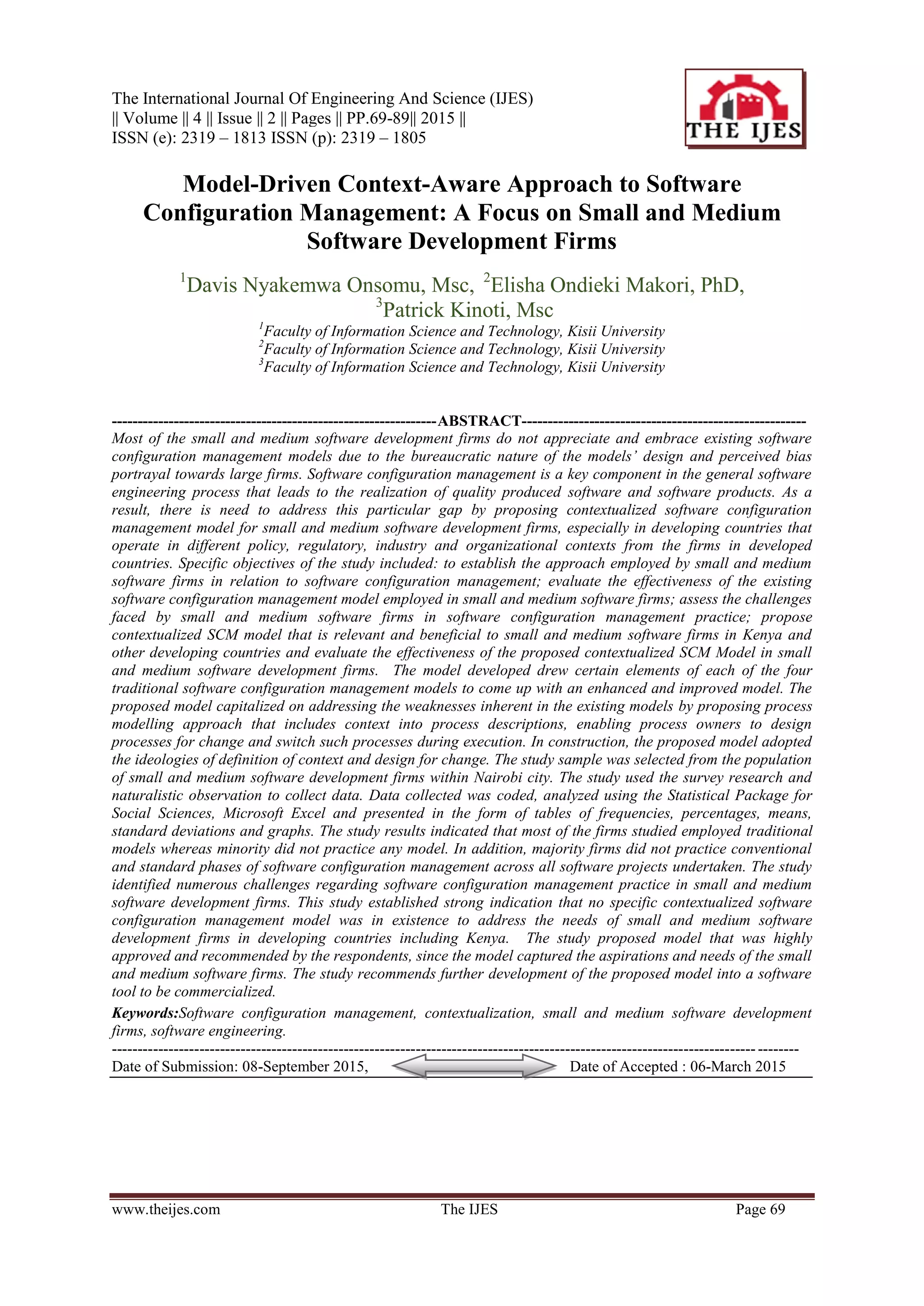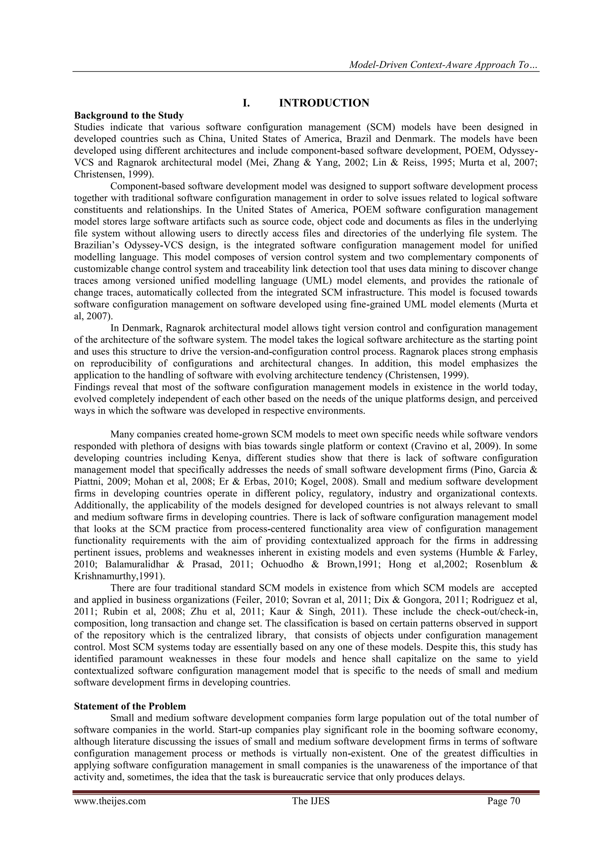 The document discusses the development of a contextualized software configuration management (SCM) model tailored for small and medium software development firms, particularly in developing countries like Kenya. It identifies the shortcomings of existing models that are oriented towards larger enterprises and proposes an improved approach that incorporates local industry context and challenges. The study also emphasizes the importance of software configuration management in ensuring quality in software products and recommends further development of the proposed model into a commercial software tool.