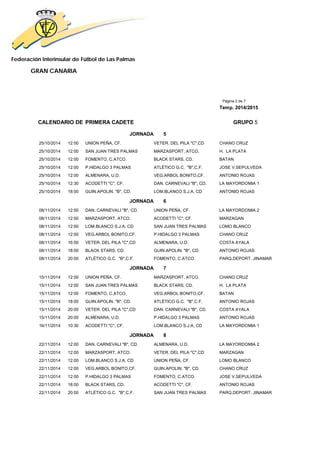 This document contains the schedule for the 2014/2015 season of the Primera Cadete Grupo 5 youth soccer league organized by the Federación Interinsular de Fútbol de Las Palmas in Gran Canaria, Spain. It lists the dates, times, locations and participating teams for 15 rounds of matches played between September 2014 and January 2015. Each round consists of 7 or 8 individual matches scheduled on Saturdays and Sundays.