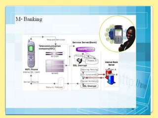Internet UsersRemittancesAuthenticate, checkbalance, transfer funds, debit/credit acctSend Transfer RequestConfirmationM-Banking SMS ServerBANK HostServerConfirmationSend CommandMobile UsersFund TransfersM-Banking – Technical issuesSecurity is the primary technical issue to considerThe GSM network natively use highly secure encryption. Over the air interception is impossible. The mobile phone number (MPN) and SMS Center (SMSC) number of the sender captured during reception, coupled with a 6-digit Mobile PIN (MPIN) can be used to authenticate the sender. The GSM modem (the hardware) & software of the M-Banking system located in the data center of the bank. All the information will stay within the data center.Technology is simple and mature – Technical issues are well understood and addressed