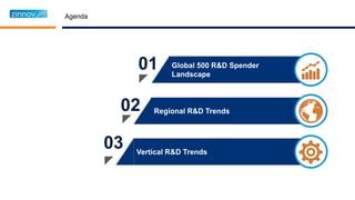 The document provides an overview of global R&D trends among the top 500 R&D spending companies from 2012-2014. Key findings include: