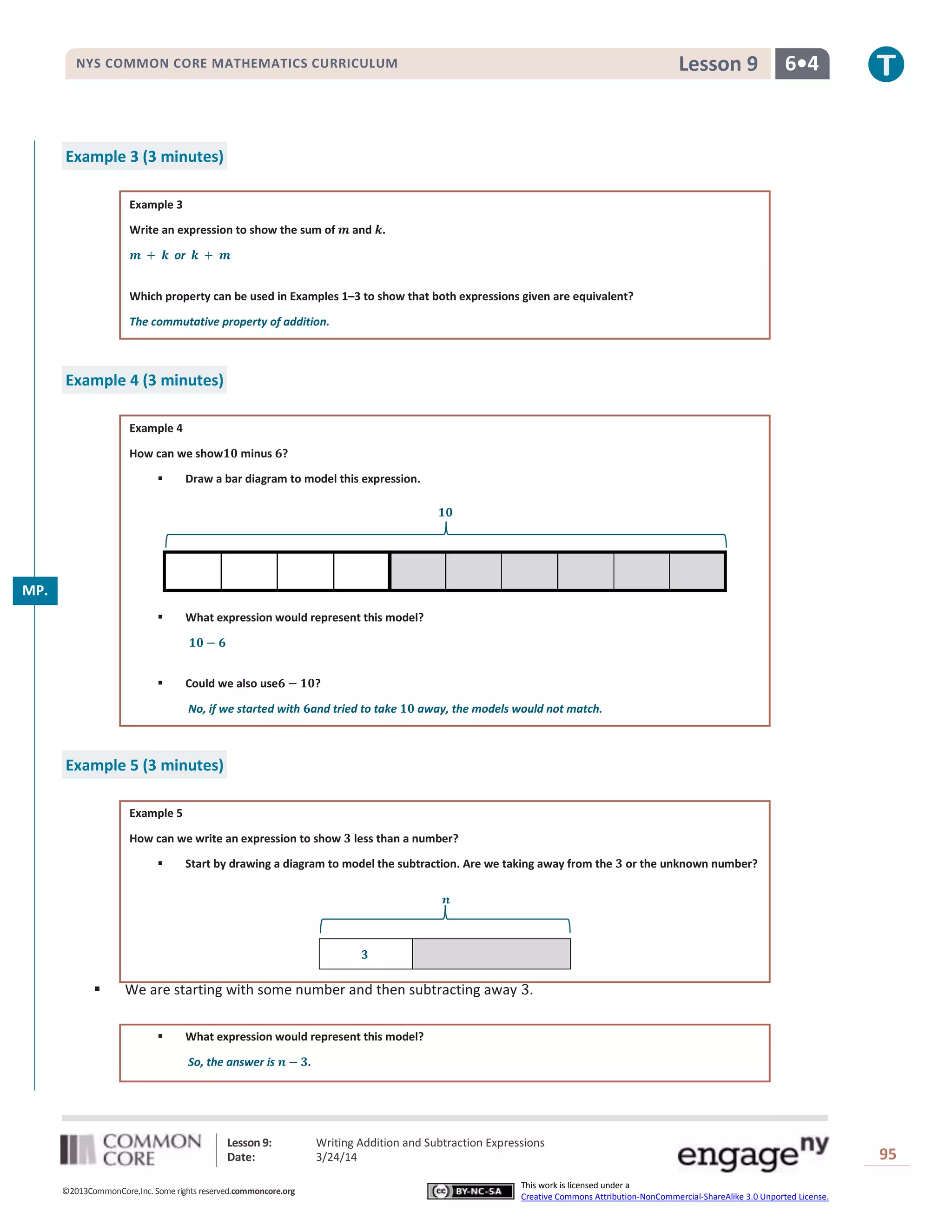 This document outlines a lesson on writing addition and subtraction expressions. It provides examples of writing expressions to represent addition and subtraction scenarios. Students are asked to write expressions for scenarios like "the sum of x and y" or "a number decreased by z". The lesson emphasizes using bar diagrams and properties of operations to show the equivalence of different expressions. Students complete exercises writing expressions and explaining when order of operations matters. The goal is for students to accurately write mathematical expressions to represent real-world addition and subtraction scenarios.