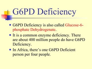 G6PD deficiency is a common enzyme deficiency affecting approximately 400 million people worldwide. It is caused by mutations in the G6PD gene located on the X chromosome, making males more likely to be affected. G6PD deficiency results in hemolytic anemia when red blood cells are exposed to oxidative agents found in certain drugs or foods like fava beans. A complete blood count or screening test can diagnose G6PD deficiency by measuring enzyme activity levels in the blood. Current treatment involves avoiding triggers like fava beans and oxidative drugs that can cause hemolysis in G6PD deficient individuals.
