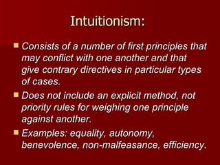 Rawlsian contract theory attempts to reconcile utilitarianism and intuitionism through a theory of distributive justice. Rawls proposes an "original position" behind a "veil of ignorance" where individuals would choose principles of justice not knowing their place in society. He argues they would choose two principles: 1) Equal basic liberties for all and 2) Social and economic inequalities must benefit the least advantaged and arise from fair equality of opportunity.