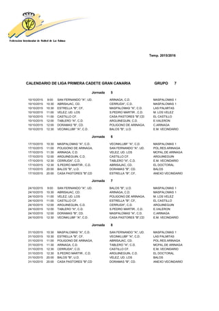 This document contains the schedule for the first cadet league of Gran Canaria Group 7. It lists the dates, times, and participating teams for 13 rounds of matches. Important notes at the bottom indicate that clubs have 5 days to report any errors in the schedule and that later changes will only be allowed due to extenuating circumstances even with club consent.