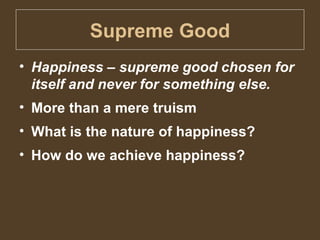 Virtue ethics focuses on developing virtuous character traits. Aristotle believed that happiness is achieved through living according to reason and developing virtues like courage, honesty, and justice. He argued that virtues represent a golden mean between extremes of character and that they allow people to function well and live happily in community with others. While virtue ethics emphasizes moral motivation and relationships, it faces challenges in providing guidance in complex situations where virtues may conflict or fail to address all scenarios.