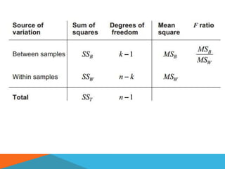 This document provides an outline and summary of key concepts related to data analysis, including measures of central tendency (mean, median, mode), spread of distribution (range, variance, standard deviation), and experimental designs (paired t-test, ANOVA). It explains how to calculate and interpret the mean, median, mode, range, variance, and standard deviation. It also provides brief definitions and examples of paired t-tests and ANOVA.