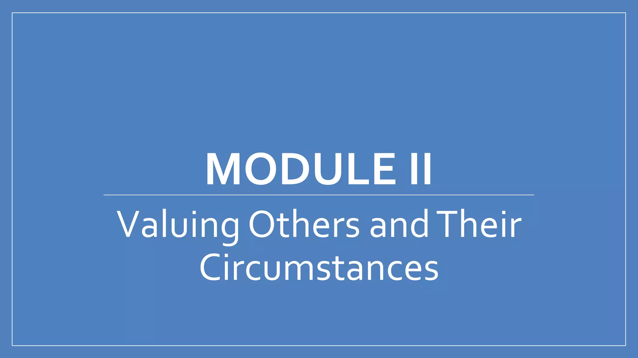 This document provides information on Module 2 of a course, including standards and lessons on valuing others. It discusses finding others' greatness, observing circumstances, feeling for others, and supporting advocacy. It also covers language registers and provides examples of frozen, formal, consultative, casual, and intimate registers. Finally, it includes a sample story in third-person limited point of view and elements to consider in prose, such as character, setting, plot, point of view, and mood.