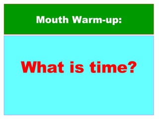 The document discusses the concept of time through various proverbs and quotations from different cultures and celebrities. It explores different perspectives on time including that it is life, money, victory, speed and strength. It also provides translations of Chinese proverbs and quotes about time from figures such as Benjamin Franklin, Thomas Fuller, and Aristotle. The document then presents some modern Chinese expressions and concludes with examples for interpreting between English and Chinese.