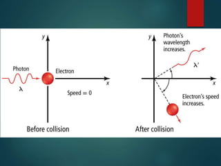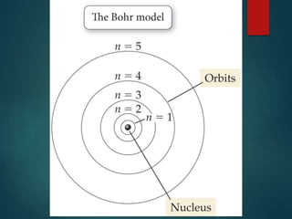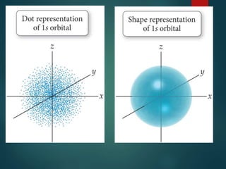 The document discusses the quantum mechanical model of the atom. It explains how the Bohr model was replaced by the quantum mechanical model based on the work of scientists like de Broglie, Heisenberg, and Schrodinger. The quantum mechanical model describes electrons as waves occupying atomic orbitals defined by quantum numbers rather than following precise orbits. The document outlines the key concepts of the quantum mechanical model including the principal, azimuthal, magnetic, and spin quantum numbers and how they define an electron's location and properties in an atom.