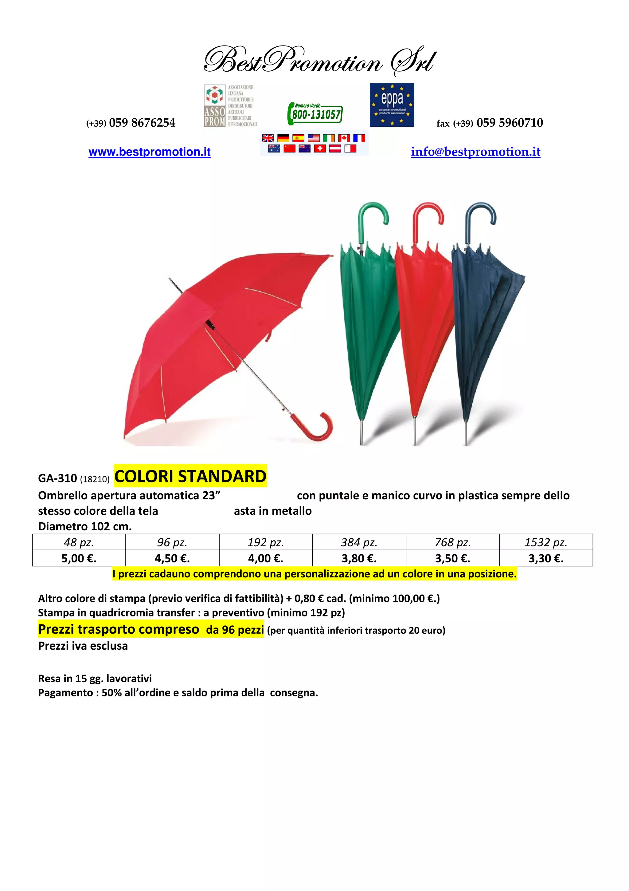 Il documento fornisce dettagli sui prezzi e le specifiche di ombrelli automatici da 23'' con personalizzazione disponibile. I prezzi variano in base alla quantità ordinata e alla scelta dei colori standard o speciali, con un costo aggiuntivo per ulteriori colori di stampa. I termini di pagamento e le condizioni di consegna sono inclusi, con un'ora di attesa prevista di 15 giorni lavorativi.
