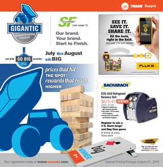 This document is a promotional flyer for Trane Supply that highlights various products and services. It encourages readers to sign up for Trane Rewards to earn savings on promotions from July through August. It showcases refrigerant recovery units, thermostats, motors, compressors, and other HVAC/R parts. It also advertises services like refrigerant reclamation and provides contact information for the rewards program.