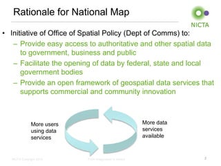 The document discusses the rationale and design goals for a proposed National Map of Australia. The National Map is an initiative to provide easy access to authoritative and other spatial data from all levels of government through an open framework. It will allow users to access maps, imagery, and geospatial data from various agencies through a single web interface. The proposed architecture is an in-browser system that connects users to multiple data services from different jurisdictions and vendors using open source mapping libraries. It will support adding additional data services and user-generated content over time.