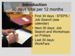 The document provides an orientation for a general assistance program that lasts 90 days. It is divided into 3 phases: STEPS workshop for job searching skills (30 days), job searching and workshops (30 days), and workfare volunteering (30 days). Participants must complete job contacts, turn in contact forms on Fridays, and may receive supportive services like transportation assistance. The goals are to help people find work and be self-sufficient through job skills training, job searching requirements, and work volunteering.