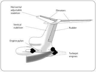 This document provides information about T-tail aircraft configurations. It defines a T-tail as having horizontal control surfaces mounted to the top of the vertical stabilizer, resembling the letter T. T-tails are common on gliders and airliners with rear-mounted engines. Advantages include smoother airflow and better pitch control. Disadvantages include potential susceptibility to deep stalls and reduced low-speed control for some aircraft. Examples of planes using T-tails are listed.