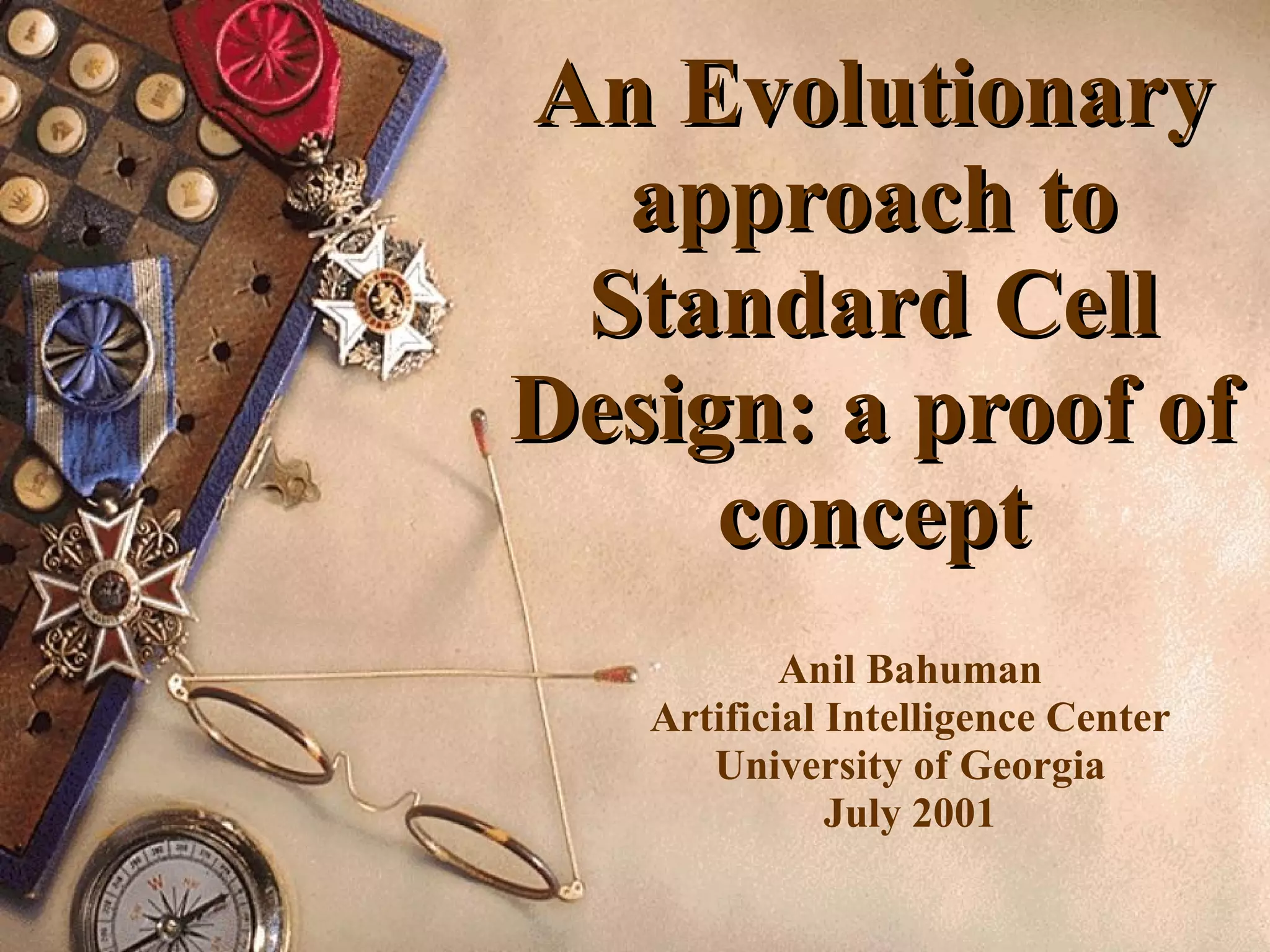 The document discusses an evolutionary approach to standard cell design aimed at automating the design process to reduce costs and time associated with creating essential building blocks of VLSI chips. It highlights the challenges of traditional design methods and presents a new methodology for generating layouts in parallel with schematics. The research emphasizes the importance of fitness functions in evaluating design correctness and connectivity while acknowledging current limitations in handling complex designs.