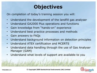 The document provides an overview of a training session on Geotech's GA2000 Plus landfill gas analyser. It discusses the history and development of Geotech's gas analyser products, how the GA2000 Plus works, its certifications, support services available, and addresses common questions. Hands-on demonstrations are included to showcase operation and calibration.