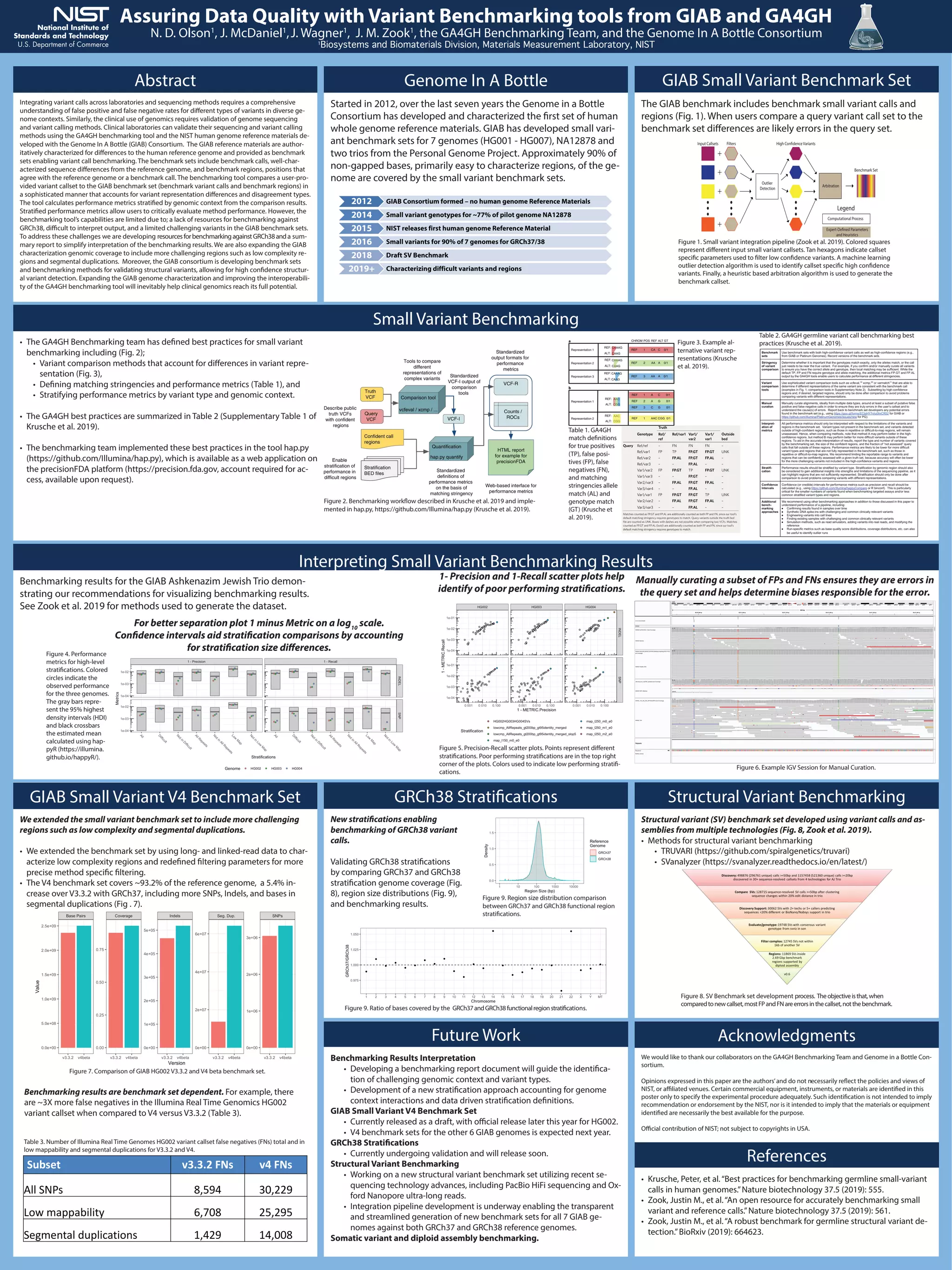 3. Future work is focused on developing new structural variant benchmarks, benchmarking against both GRCh37 and GRCh38, and benchmarking somatic and diploid variants.