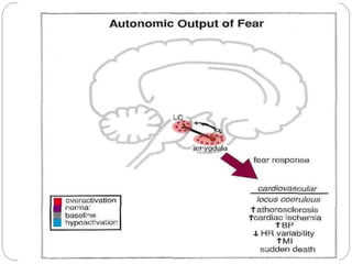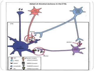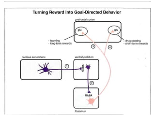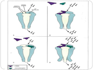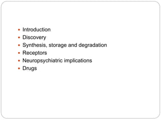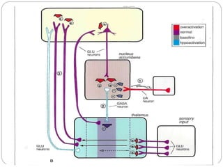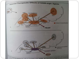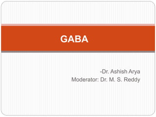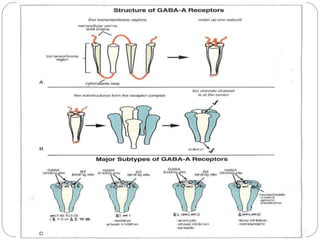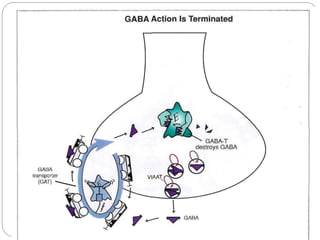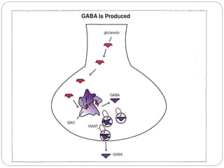 Gamma-aminobutyric acid (GABA) is the primary inhibitory neurotransmitter in the mammalian CNS, implicated in various neuropsychiatric disorders including anxiety, mood disorders, and schizophrenia. The document outlines GABA's discovery, synthesis, receptor types, and its significant role in regulating neurological activities and inhibiting neuron excitation. It also discusses the implications of GABAergic dysfunction in conditions like epilepsy and the neurochemical pathways involved in addiction and reward circuitry.