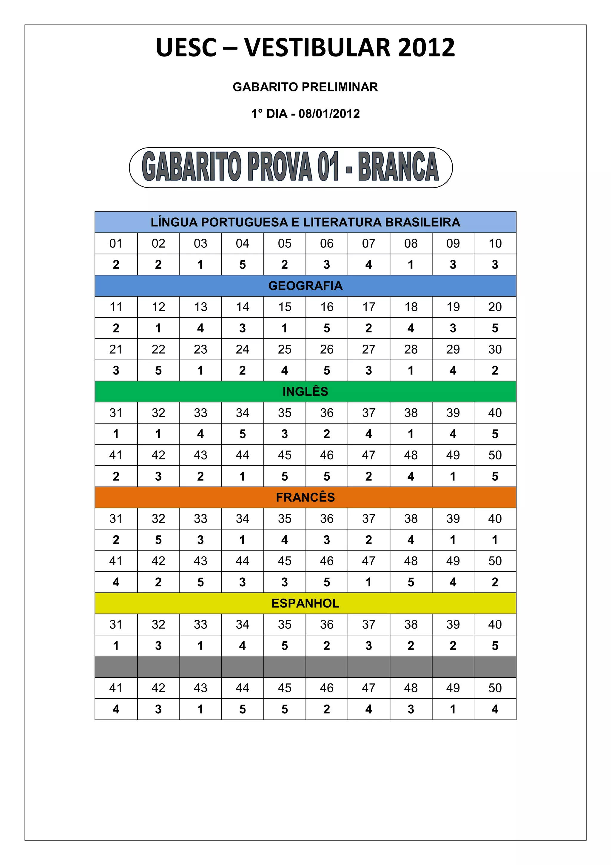 2012 GABARITO PRELIMINAR 1° DIA - 08/01/2012 LÍNGUA PORTUGUESA E LITERATURA BRASILEIRA 01 02 03 04 05 06 07 08 09 10 5 5 4 3 5 1 2 4 1 1 GEOGRAFIA 11 12 13 14 15 16 17 18 19 20 5 4 2 1 4 3 5 2 1 3 21 22 23 24 25 26 27 28 29 30 1 3 4 5 2 3 1 4 2 5 INGLÊS 31 32 33 34 35 36 37 38 39 40 4 4 2 3 1 5 2 4 2 3 41 42 43 44 45 46 47 48 49 50 5 1 5 4 3 3 5 2 4 3 FRANCÊS 31 32 33 34 35 36 37 38 39 40 5 3 1 4 2 1 5 2 4 4 41 42 43 44 45 46 47 48 49 50 2 5 3 1 1 3 4 3 2 5 ESPANHOL 31 32 33 34 35 36 37 38 39 40 4 1 4 2 3 5 1 5 5 3 41 42 43 44 45 46 47 48 49 50 2 1 4 3 3 5 2 1 4 2