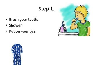 To get ready for bed, brush your teeth and shower, then put on pajamas. Next, get in your bedroom, open the blankets, and climb into bed where you should stretch and take deep breaths. Finally, close your eyes, think relaxing thoughts, and drift off to sleep.