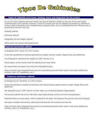 There are four main types of computer cabinets: desktop, minitower, integrated display, and tower. Desktop cabinets are designed to lie horizontally and can accommodate a monitor on top. Minitower cabinets stand vertically and take up more desk space but have better airflow. Integrated display cabinets combine the display and computer into one chassis, saving space but disabling both components if one fails. Tower cabinets are large vertical structures used for servers and duplicating drives, and can support multiple internal fans.