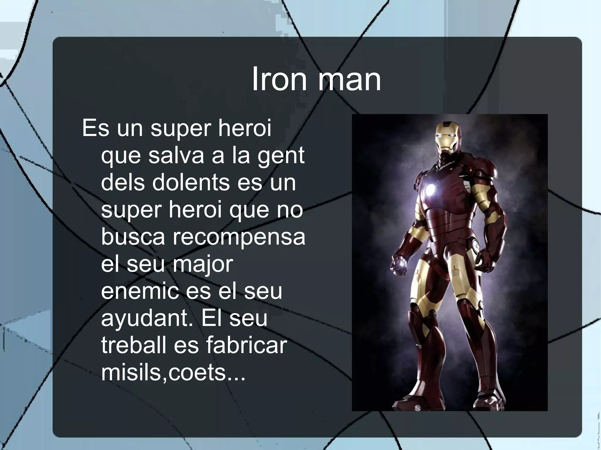 Iron man Esun super heroi que salva a la gent dels dolents es un super heroi que no busca recompensa el seu major enemic es el seu ayudant. El seu treball es fabricar misils,coets...