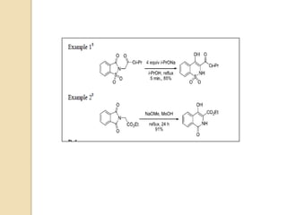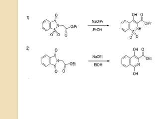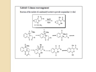 The Gabriel-Colman rearrangement reaction involves the rearrangement of saccharin or phthalimido ester with a strong base such as an alkoxide to form substituted isoquinolines. This is a ring expansion reaction that requires the nitrogen atom to abstract an enolizable hydrogen to form a carbanion that closes the ring. The displacement of the alkoxide is analogous to the Dieckman condensation, resulting in ring closure. The carbonyl groups on the ring can tautomerize between keto and enol forms, and the amide can tautomerize to an imidic acid form.