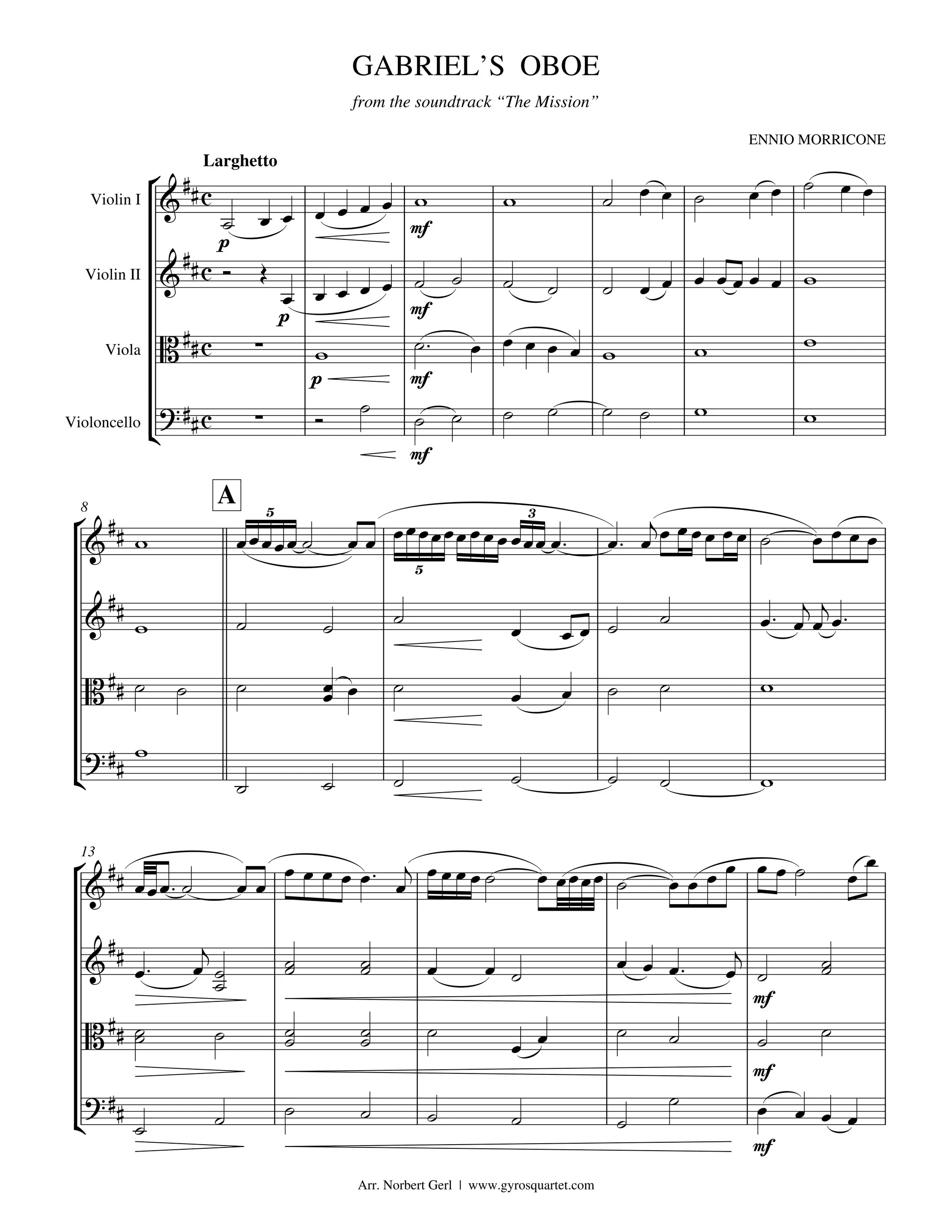 This document is a musical score for "Gabriel's Oboe" composed by Ennio Morricone for the film soundtrack of "The Mission". The score is written for string instruments including violin I and II, viola, and violoncello. It provides the musical notation through various symbols indicating tempo, dynamics, and notes to be played by each instrument.