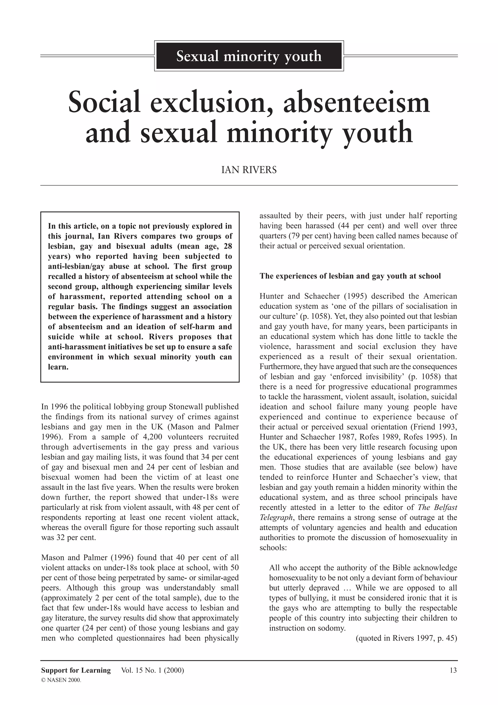 1. The document discusses a study that compares two groups of LGBT adults - one group that reported a history of absenteeism in school due to anti-LGBT abuse, and another group that experienced similar abuse but did not have absenteeism. 2. The study found that those with a history of absenteeism reported being more frightened by looks from others, being ridiculed in front of others, and having belongings stolen, compared to those without absenteeism. 3. However, both groups reported similar levels and durations of anti-LGBT abuse, and there were no significant differences found in levels of social support or academic achievement between the groups.