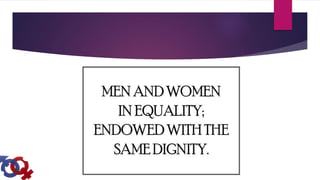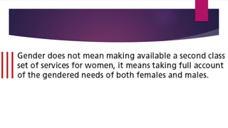The document discusses Philippine laws and policies related to promoting gender equality and empowering women, including the Women in Development and Nation-Building Act, Magna Carta of Women, and Responsible Parenthood and Reproductive Health Act. It also outlines the Philippine Plan for Gender-Responsive Development's objectives of eliminating gender bias in education, upgrading education system efficiency, ensuring equitable access for women, and raising awareness of women's issues. While the government has increased funding for its Gender and Development budget over time, compliance with allocating funds has remained low and there is no mechanism to actively promote compliance.