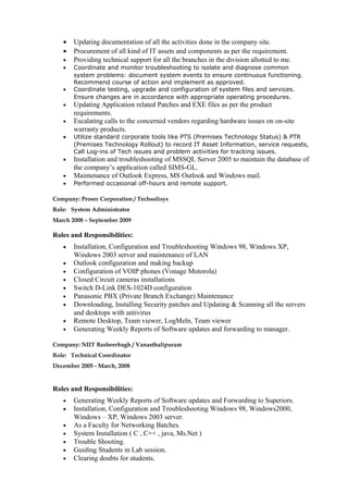 V S Pavan Kumar Gadey is seeking a position as a System Administrator. He has over 10 years of experience in roles such as IT Help Desk Executive, System Administrator, and Technical Coordinator. His experience includes providing technical support, hardware and software installations, administration of backups, network troubleshooting, and maintenance of servers and operating systems such as Windows 2000/2003/2008. He has strong communication, problem-solving, and technical skills.