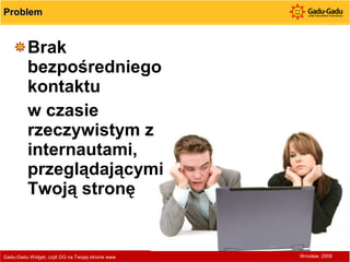 Problem Brak bezpośredniegokontaktu w czasie rzeczywistym z internautami, przeglądającymi Twoją stronę Wrocław, 2009 Gadu-Gadu Widget, czyli GG na Twojej stronie www